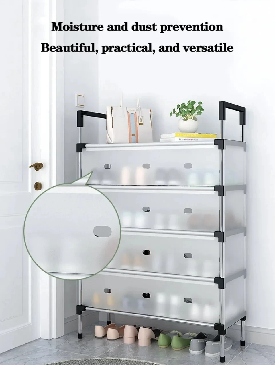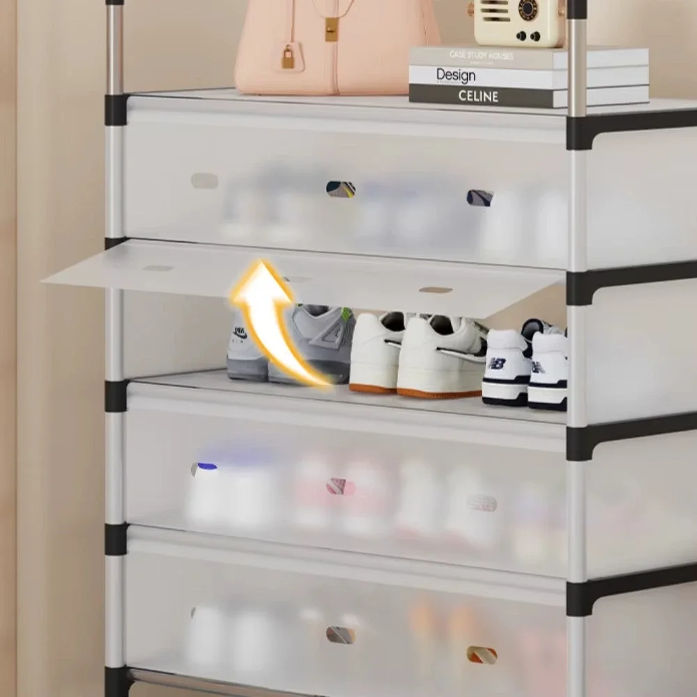 Conçu avec des matériaux résistants, ce meuble de rangement supporte le poids de plusieurs paires de chaussures sans se déformer, tout en restant léger et facile à déplacer.